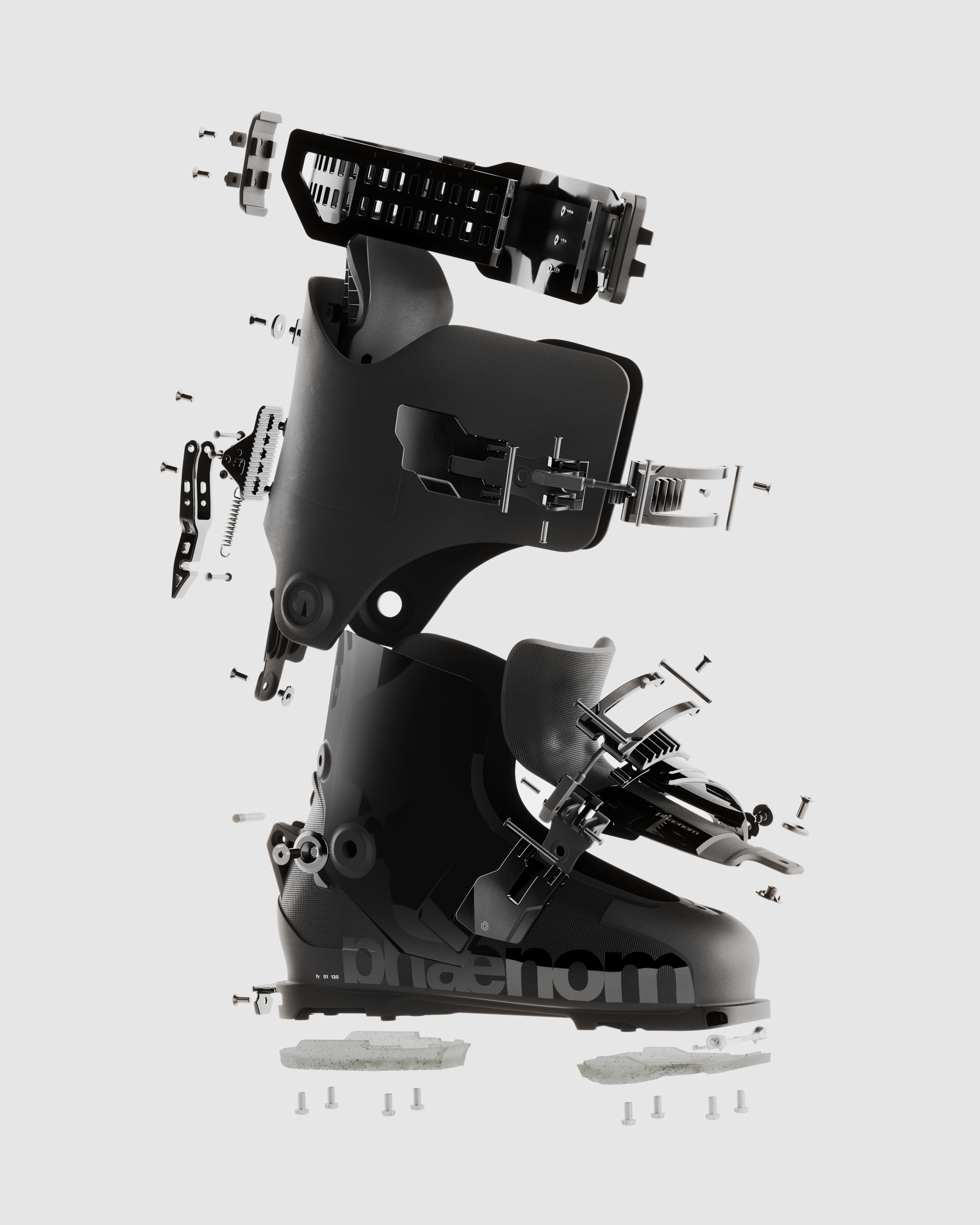 La chaussure de freeride fr 01 130, débrayable avec inserts, est équipé pour vous emmener hors des sentiers battus. Développée pour offrir des performances exceptionnelles en descente, similaires aux meilleures chaussures alpines, elle possède un veritable indice de flexion de 130. Sa construction hybride cabrio / overlap innovante combine le meilleur des deux mondes : Le Flex progressif de la construction 3-pièces d’une cabrio avec l'ajustement et le contrôle du collier d’une overlap, associé au nouveau strap phaenom en instance de brevet. L'élasticité du strap génère un rebond tangible dans les virages, améliorant ainsi la transmission de la puissance, la précision dans l'amorce des virages, le confort et la prévisibilité. La fr 01 130 propose un rebond, une absorption des chocs et un contrôle de la flexion inégalés. Le choix d’un design épuré, entièrement noir, facilite la réparation et la réutilisation de la chaussure et de ses composants. Chaque élément de ce produit - des coques aux boucles, en passant par les sangles et les vis – a été conçu pour être réparable et recyclable.