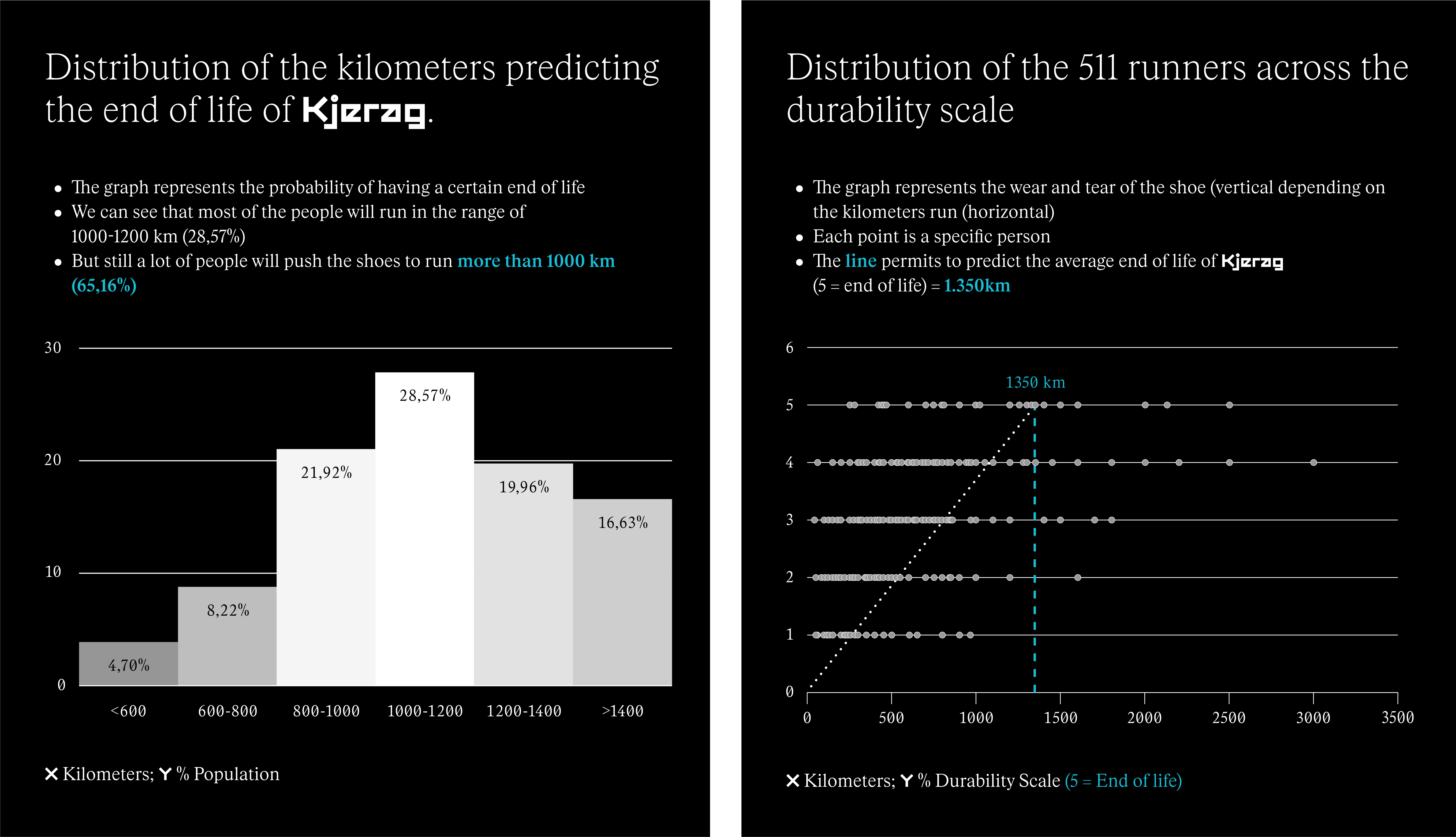 Но преди да достигнат до този извод, бегачите предоставиха данни относно тяхното тегло, километрите, които са изминали с моделът обувки Kjerag, типа терен, по който са ги използвали, и нивото на износване на обувките, което беше измерено със специално изработена скала за устойчивост.